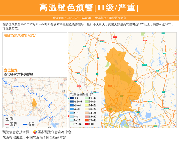 黄陂区气象台2022年07月25日06时41分发布高温橙色预警信号:预计今天白天,黄陂大部最高气温将达37℃以上,局部可达39℃,请注意防范。 信息来源:国家预警信息发布中心; 发布单位:黄陂区气象台。