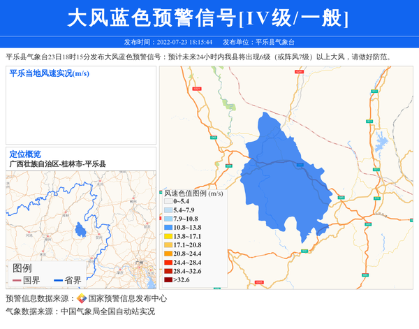 平乐县气象台23日18时15分发布大风蓝色预警信号:预计未来24小时内我县将出现6级(或阵风7级)以上大风,请做好防范。 信息来源:国家预警信息发布中心; 发布单位:平乐县气象台。