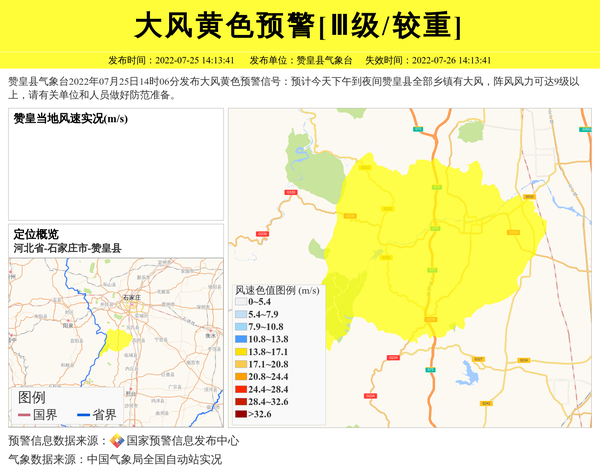 赞皇县气象台2022年07月25日14时06分发布大风黄色预警信号:预计今天下午到夜间赞皇县全部乡镇有大风,阵风风力可达9级以上,请有关单位和人员做好防范准备。 信息来源:国家预警信息发布中心; 发布单位:赞皇县气象台。