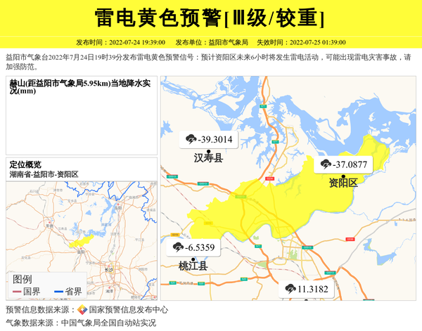 益阳市气象台2022年7月24日19时39分发布雷电黄色预警信号:预计资阳区未来6小时将发生雷电活动,可能出现雷电灾害事故,请加强防范。 信息来源:国家预警信息发布中心; 发布单位:益阳市气象局。