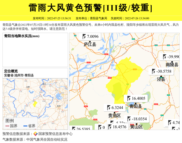 青阳县气象台2022年07月25日13时34分发布雷雨大风黄色预警信号。未来6小时内我县杜村、陵阳等乡镇将出现雷雨大风天气,风力达7-8级并伴有雷电、短时强降水。请注意防范! 信息来源:国家预警信息发布中心; 发布单位:青阳县气象局。