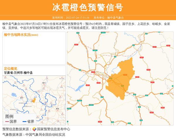 榆中县气象台2022年07月24日17时51分发布冰雹橙色预警信号:预计6小时内,我县青城镇、园子岔乡、上花岔乡、哈岘乡、金崖镇、贡井镇、中连川乡等地区可能出现冰雹天气,并可能造成雹灾。请注意防范! 信息来源:国家预警信息发布中心; 发布单位:榆中县气象台。