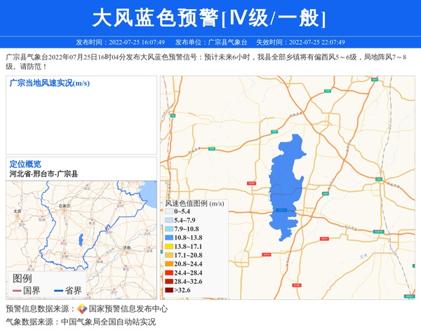 广宗县气象台2022年07月25日16时04分发布大风蓝色预警信号:预计未来6小时,我县全部乡镇将有偏西风5~6级,局地阵风7~8级。请防范! 信息来源:国家预警信息发布中心; 发布单位:广宗县气象台。