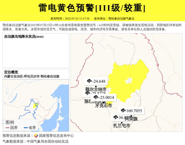 鄂伦春自治旗气象台2022年07月23日11时14分发布雷电黄色预警信号:6小时内宜里镇、诺敏镇将发生雷电活动,局部地区伴有短时强降水、雷暴大风、冰雹等强对流天气,可能造成雷电、洪涝、城市内涝等灾害事故。请有关单位和人员做好防范准备。 信息来源:国家预警信息发布中心; 发布单位:鄂伦春自治旗气象台。