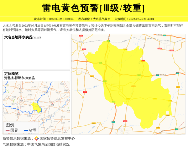 大名县气象台2022年07月25日15时38分发布雷电黄色预警信号:预计今天下午到夜间我县全部乡镇将出现雷雨天气,雷雨时可能伴有短时强降水、短时大风等强对流天气,请有关单位和人员做好防范准备。 信息来源:国家预警信息发布中心; 发布单位:大名县气象台。