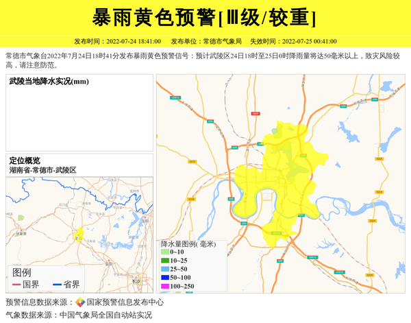 常德市气象台2022年7月24日18时41分发布暴雨黄色预警信号:预计武陵区24日18时至25日0时降雨量将达50毫米以上,致灾风险较高,请注意防范。 信息来源:国家预警信息发布中心; 发布单位:常德市气象局。