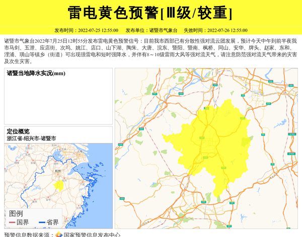 诸暨市气象台2022年7月25日12时55分发布雷电黄色预警信号:目前我市西部已有分散性强对流云团发展,预计今天中午到前半夜我市马剑、五泄、应店街、次坞、姚江、店口、山下湖、陶朱、大唐、浣东、暨阳、暨南、枫桥、同山、安华、牌头、赵家、东和、浬浦、璜山等镇乡(街道)可出现强雷电和短时强降水,并伴有8~10级雷雨大风等强对流天气,请注意防范强对流天气带来的灾害及次生灾害。 信息来源:国家预警信息发布中心; 发布单位:诸暨市气象台。