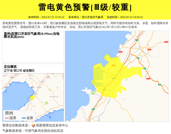 雷电黄色预警信号:预计未来6小时,营口鲅鱼圈区及渤海北部海域将出现雷电天气,同时可能伴有短时大风、冰雹、短时强降水等强对流天气, 请做好防雷工作,尽量避免户外作业、活动。营口开发区气象台2022年7月23日13时47分发布 信息来源:国家预警信息发布中心; 发布单位:营口开发区气象局。