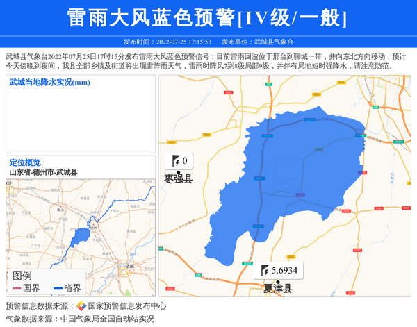 武城县气象台2022年07月25日17时15分发布雷雨大风蓝色预警信号:目前雷雨回波位于邢台到聊城一带,并向东北方向移动,预计今天傍晚到夜间,我县全部乡镇及街道将出现雷阵雨天气,雷雨时阵风7到8级局部9级,并伴有局地短时强降水,请注意防范。 信息来源:国家预警信息发布中心; 发布单位:武城县气象台。