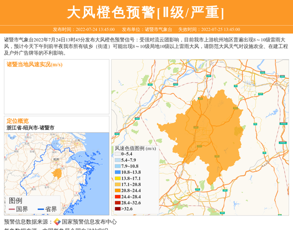 诸暨市气象台2022年7月24日13时45分发布大风橙色预警信号:受强对流云团影响,目前我市上游杭州地区普遍出现8~10级雷雨大风,预计今天下午到前半夜我市所有镇乡(街道)可能出现8~10级局地10级以上雷雨大风,请防范大风天气对设施农业、在建工程及户外广告牌等的不利影响。 信息来源:国家预警信息发布中心; 发布单位:诸暨市气象台。