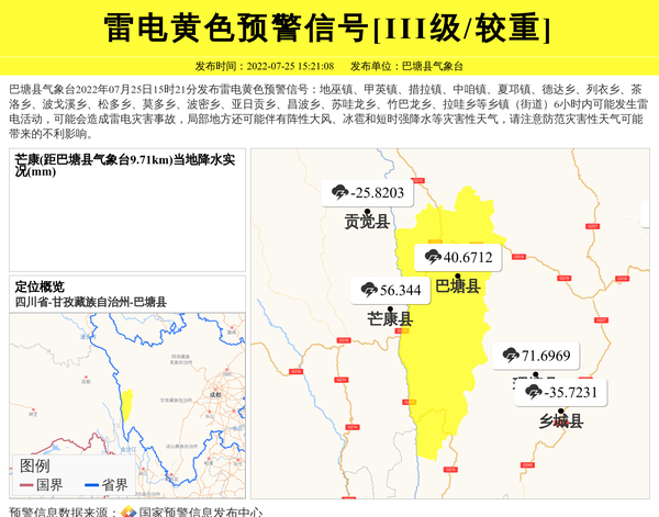 巴塘县气象台2022年07月25日15时21分发布雷电黄色预警信号:地巫镇、甲英镇、措拉镇、中咱镇、夏邛镇、德达乡、列衣乡、茶洛乡、波戈溪乡、松多乡、莫多乡、波密乡、亚日贡乡、昌波乡、苏哇龙乡、竹巴龙乡、拉哇乡等乡镇(街道)6小时内可能发生雷电活动,可能会造成雷电灾害事故,局部地方还可能伴有阵性大风、冰雹和短时强降水等灾害性天气,请注意防范灾害性天气可能带来的不利影响。 信息来源:国家预警信息发布中心; 发布单位:巴塘县气象台。