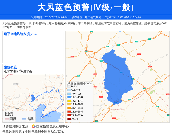 大风蓝色预警信号:预计25日傍晚,建平县偏南风4到6级,阵风7到8级,请注意防范高空坠物,避免高空作业。建平县气象台2022年7月25日16时1分发布 信息来源:国家预警信息发布中心; 发布单位:建平县气象局。