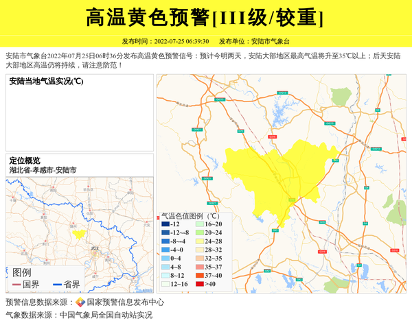 安陆市气象台2022年07月25日06时36分发布高温黄色预警信号:预计今明两天,安陆大部地区最高气温将升至35℃以上;后天安陆大部地区高温仍将持续,请注意防范! 信息来源:国家预警信息发布中心; 发布单位:安陆市气象台。