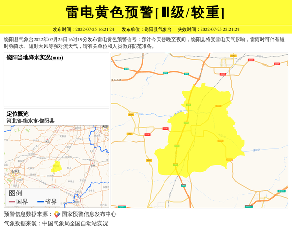 饶阳县气象台2022年07月25日16时19分发布雷电黄色预警信号:预计今天傍晚至夜间,饶阳县将受雷电天气影响,雷雨时可伴有短时强降水、短时大风等强对流天气,请有关单位和人员做好防范准备。 信息来源:国家预警信息发布中心; 发布单位:饶阳县气象台。