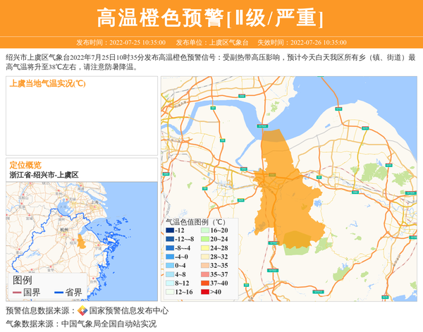 绍兴市上虞区气象台2022年7月25日10时35分发布高温橙色预警信号:受副热带高压影响,预计今天白天我区所有乡(镇、街道)最高气温将升至38℃左右,请注意防暑降温。 信息来源:国家预警信息发布中心; 发布单位:上虞区气象台。