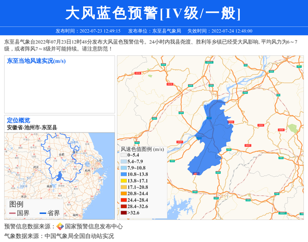 东至县气象台2022年07月23日12时48分发布大风蓝色预警信号。24小时内我县尧渡、胜利等乡镇已经受大风影响, 平均风力为6~7级,或者阵风7~8级并可能持续。请注意防范! 信息来源:国家预警信息发布中心; 发布单位:东至县气象局。