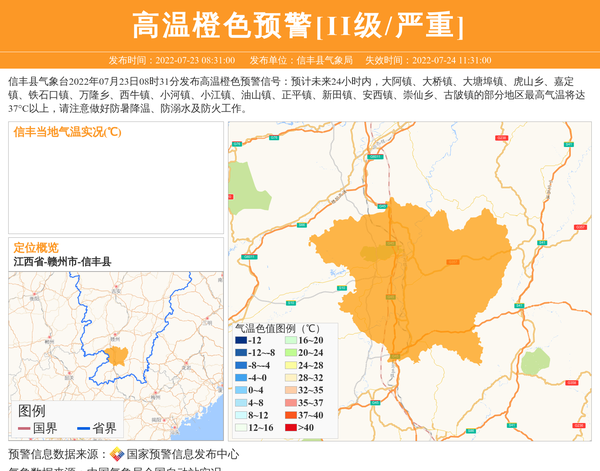 信丰县气象台2022年07月23日08时31分发布高温橙色预警信号:预计未来24小时内,大阿镇、大桥镇、大塘埠镇、虎山乡、嘉定镇、铁石口镇、万隆乡、西牛镇、小河镇、小江镇、油山镇、正平镇、新田镇、安西镇、崇仙乡、古陂镇的部分地区最高气温将达37°C以上,请注意做好防暑降温、防溺水及防火工作。 信息来源:国家预警信息发布中心; 发布单位:信丰县气象局。