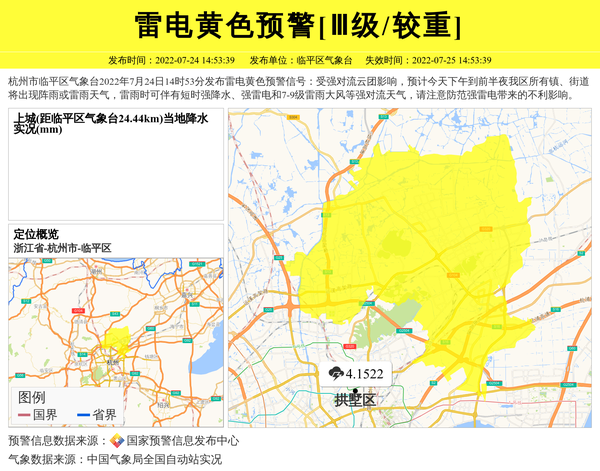 杭州市临平区气象台2022年7月24日14时53分发布雷电黄色预警信号:受强对流云团影响,预计今天下午到前半夜我区所有镇、街道将出现阵雨或雷雨天气,雷雨时可伴有短时强降水、强雷电和7-9级雷雨大风等强对流天气,请注意防范强雷电带来的不利影响。 信息来源:国家预警信息发布中心; 发布单位:临平区气象台。