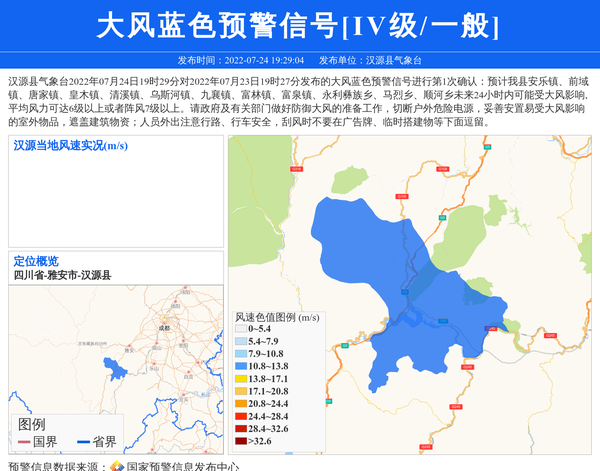 汉源县气象台2022年07月24日19时29分对2022年07月23日19时27分发布的大风蓝色预警信号进行第1次确认:预计我县安乐镇、前域镇、唐家镇、皇木镇、清溪镇、乌斯河镇、九襄镇、富林镇、富泉镇、永利彝族乡、马烈乡、顺河乡未来24小时内可能受大风影响,平均风力可达6级以上或者阵风7级以上。请政府及有关部门做好防御大风的准备工作,切断户外危险电源,妥善安置易受大风影响的室外物品,遮盖建筑物资;人员外出注意行路、行车安全,刮风时不要在广告牌、临时搭建物等下面逗留。 信息来源:国家预警信息发布中心; 发布单位:汉源县气象台。