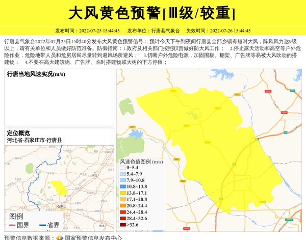 行唐县气象台2022年07月25日15时40分发布大风黄色预警信号:预计今天下午到夜间行唐县全部乡镇有短时大风,阵风风力达9级以上,请有关单位和人员做好防范准备。防御指南:1.政府及相关部门按照职责做好防大风工作;2.停止露天活动和高空等户外危险作业,危险地带人员和危房居民尽量转到避风场所避风;3.切断户外危险电源,加固围板、棚架、广告牌等易被大风吹动的搭建物;4.不要在高大建筑物、广告牌、临时搭建物或大树的下方停留; 信息来源:国家预警信息发布中心; 发布单位:行唐县气象台。