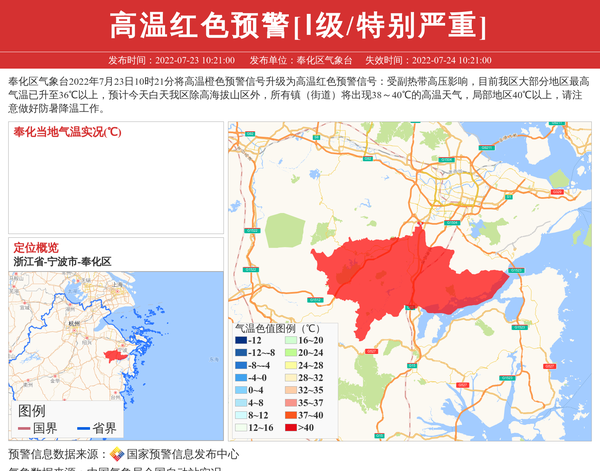 奉化区气象台更新高温红色预警[Ⅰ级/特别严重]