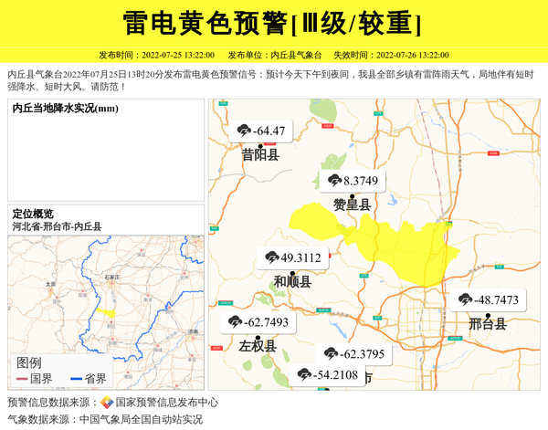 内丘县气象台2022年07月25日13时20分发布雷电黄色预警信号:预计今天下午到夜间,我县全部乡镇有雷阵雨天气,局地伴有短时强降水、短时大风。请防范! 信息来源:国家预警信息发布中心; 发布单位:内丘县气象台。