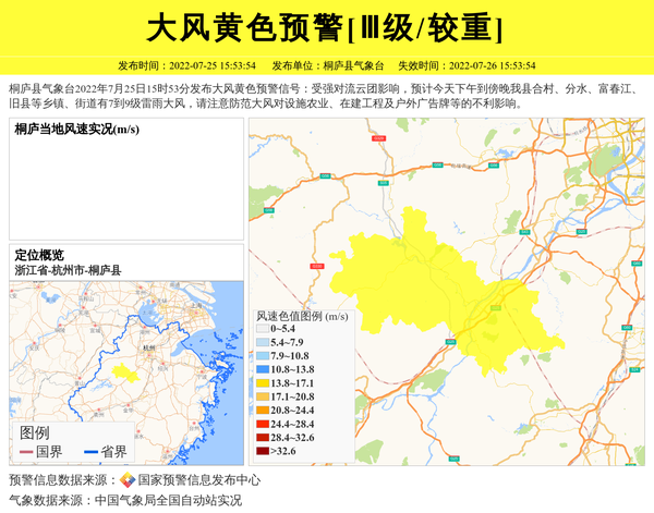桐庐县气象台2022年7月25日15时53分发布大风黄色预警信号:受强对流云团影响,预计今天下午到傍晚我县合村、分水、富春江、旧县等乡镇、街道有7到9级雷雨大风,请注意防范大风对设施农业、在建工程及户外广告牌等的不利影响。 信息来源:国家预警信息发布中心; 发布单位:桐庐县气象台。