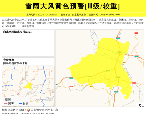 白水县气象台2022年7月24日20时30分发布雷雨大风黄色预警信号:预计25日02时至14时,我县城关街道办、尧禾镇、林皋镇、杜康镇、北塬镇、史官镇、西固镇、雷牙镇部分地方可能受雷雨大风影响,阵风可达6级或以上并伴有雷暴,局地有短时暴雨,小时雨量可达20毫米以上,请注意防范。 信息来源:国家预警信息发布中心; 发布单位:白水县气象台。