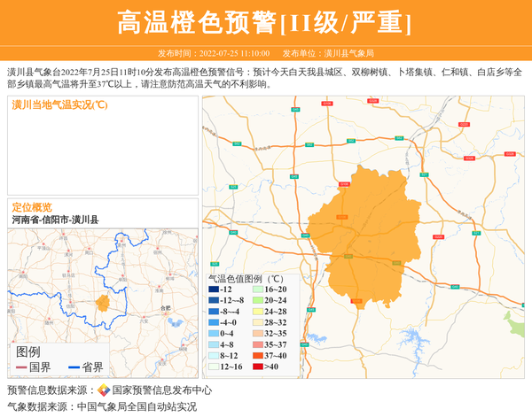 潢川县气象台2022年7月25日11时10分发布高温橙色预警信号:预计今天白天我县城区、双柳树镇、卜塔集镇、仁和镇、白店乡等全部乡镇最高气温将升至37℃以上,请注意防范高温天气的不利影响。 信息来源:国家预警信息发布中心; 发布单位:潢川县气象局。