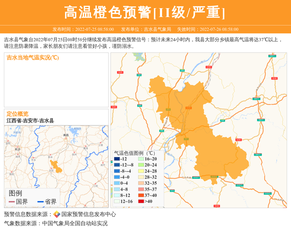 吉水县气象台2022年07月25日08时58分继续发布高温橙色预警信号:预计未来24小时内,我县大部分乡镇最高气温将达37℃以上,请注意防暑降温,家长朋友们请注意看管好小孩,谨防溺水。 信息来源:国家预警信息发布中心; 发布单位:吉水县气象局。