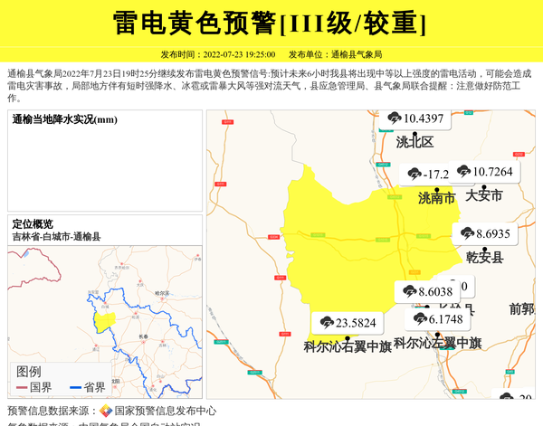 通榆县气象局发布雷电黄色预警[III级/较重] 相关文章
