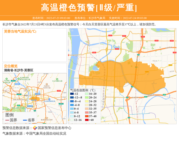 长沙市气象台2022年7月23日9时3分发布高温橙色预警信号:今天白天芙蓉区最高气温将升至37℃以上,请加强防范。 信息来源:国家预警信息发布中心; 发布单位:长沙市气象局。