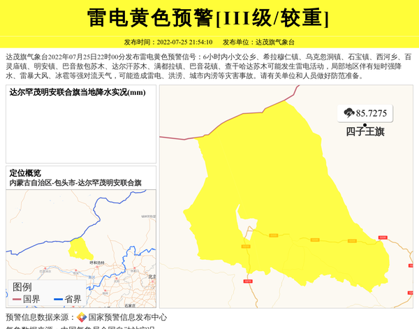达茂旗气象台2022年07月25日22时00分发布雷电黄色预警信号:6小时内小文公乡、希拉穆仁镇、乌克忽洞镇、石宝镇、西河乡、百灵庙镇、明安镇、巴音敖包苏木、达尔汗苏木、满都拉镇、巴音花镇、查干哈达苏木可能发生雷电活动,局部地区伴有短时强降水、雷暴大风、冰雹等强对流天气,可能造成雷电、洪涝、城市内涝等灾害事故。请有关单位和人员做好防范准备。 信息来源:国家预警信息发布中心; 发布单位:达茂旗气象台。
