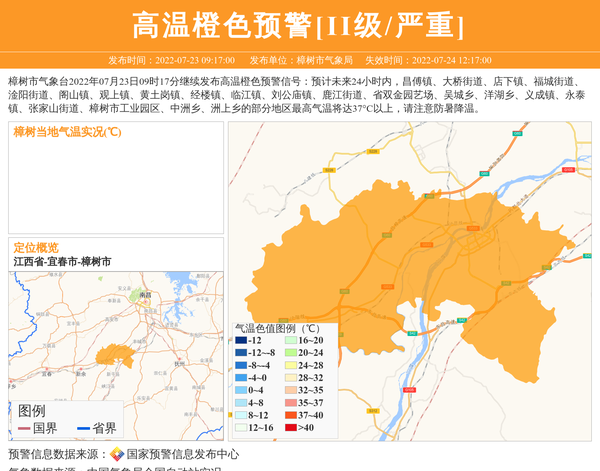 樟树市气象台2022年07月23日09时17分继续发布高温橙色预警信号:预计未来24小时内,昌傅镇、大桥街道、店下镇、福城街道、淦阳街道、阁山镇、观上镇、黄土岗镇、经楼镇、临江镇、刘公庙镇、鹿江街道、省双金园艺场、吴城乡、洋湖乡、义成镇、永泰镇、张家山街道、樟树市工业园区、中洲乡、洲上乡的部分地区最高气温将达37°C以上,请注意防暑降温。 信息来源:国家预警信息发布中心; 发布单位:樟树市气象局。