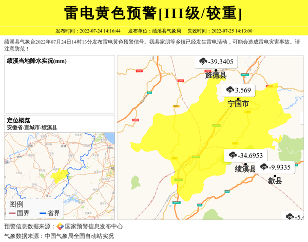 绩溪县气象台2022年07月24日14时13分发布雷电黄色预警信号。我县家朋等乡镇已经发生雷电活动,可能会造成雷电灾害事故。请注意防范! 信息来源:国家预警信息发布中心; 发布单位:绩溪县气象局。