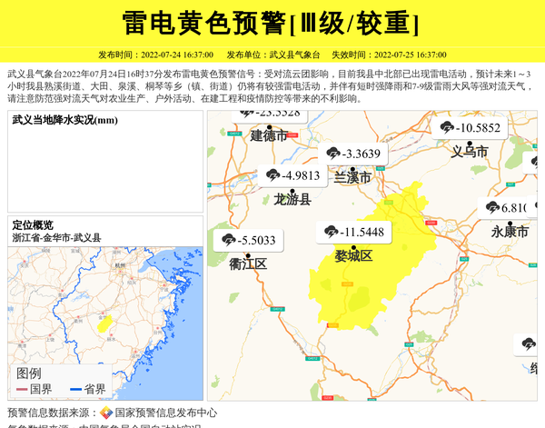 武义县气象台2022年07月24日16时37分发布雷电黄色预警信号:受对流云团影响,目前我县中北部已出现雷电活动,预计未来1~3小时我县熟溪街道、大田、泉溪、桐琴等乡(镇、街道)仍将有较强雷电活动,并伴有短时强降雨和7-9级雷雨大风等强对流天气,请注意防范强对流天气对农业生产、户外活动、在建工程和疫情防控等带来的不利影响。 信息来源:国家预警信息发布中心; 发布单位:武义县气象台。