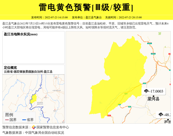 盈江县气象台2022年7月23日14时15分发布雷电黄色预警信号:目前盈江县油松岭、平原、旧城等乡镇已出现雷电天气,预计未来6小时盈江大部地区将出现雷电,局地可能伴有6级以上阵性大风、短时强降水等强对流天气,请注意防范。 信息来源:国家预警信息发布中心; 发布单位:盈江县气象台。