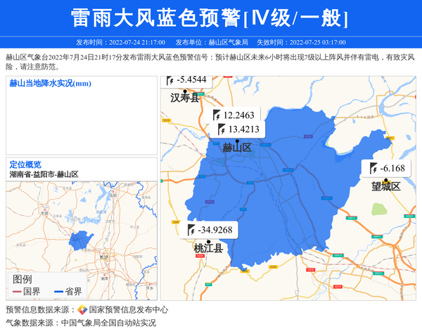 赫山区气象台2022年7月24日21时17分发布雷雨大风蓝色预警信号:预计赫山区未来6小时将出现7级以上阵风并伴有雷电,有致灾风险,请注意防范。 信息来源:国家预警信息发布中心; 发布单位:赫山区气象局。