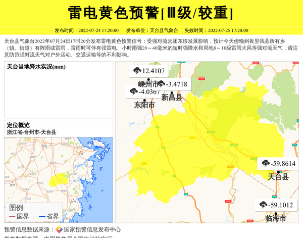 天台县气象台2022年07月24日17时20分发布雷电黄色预警信号:受强对流云团东移发展影响,预计今天傍晚到夜里我县所有乡(镇、街道)有阵雨或雷雨,雷雨时可伴有强雷电、小时雨强20~40毫米的短时强降水和局地8~10级雷雨大风等强对流天气,请注意防范强对流天气对户外活动、交通运输等的不利影响。 信息来源:国家预警信息发布中心; 发布单位:天台县气象台。