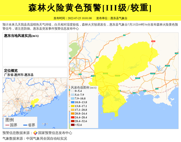 预计未来几天我县高温晴热天气持续,白天相对湿度较低,森林火灾较易发生,惠东县气象台7月25日09时56分发布森林火险黄色预警信号,请注意防御。惠东县突发事件预警信息发布中心 信息来源:国家预警信息发布中心; 发布单位:惠东县气象台。
