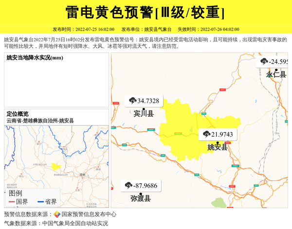 姚安县气象台2022年7月25日16时02分发布雷电黄色预警信号:姚安县境内已经受雷电活动影响,且可能持续,出现雷电灾害事故的可能性比较大,并局地伴有短时强降水、大风、冰雹等强对流天气,请注意防范。 信息来源:国家预警信息发布中心; 发布单位:姚安县气象台。
