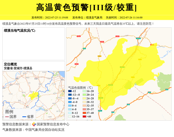 绩溪县气象台2022年07月25日11时16分发布高温黄色预警信号。未来三天我县日最高气温将在35℃以上。请注意防范! 信息来源:国家预警信息发布中心; 发布单位:绩溪县气象局。