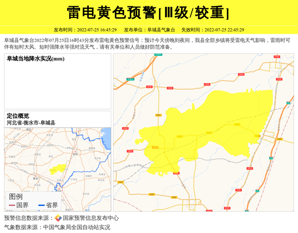 阜城县气象台2022年07月25日16时43分发布雷电黄色预警信号:预计今天傍晚到夜间,我县全部乡镇将受雷电天气影响,雷雨时可伴有短时大风、短时强降水等强对流天气,请有关单位和人员做好防范准备。 信息来源:国家预警信息发布中心; 发布单位:阜城县气象台。