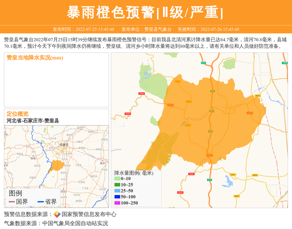 赞皇县气象台2022年07月25日15时39分继续发布暴雨橙色预警信号:目前我县北清河累计降水量已达84.7毫米,清河70.8毫米,县城70.1毫米,预计今天下午到夜间降水仍将继续,赞皇镇、清河乡小时降水量将达到80毫米以上,请有关单位和人员做好防范准备。 信息来源:国家预警信息发布中心; 发布单位:赞皇县气象台。