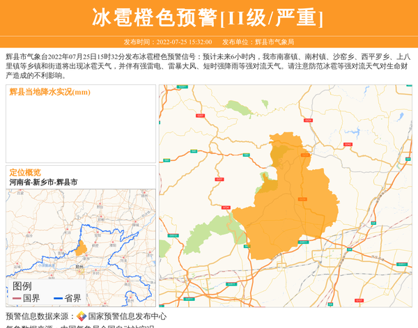 辉县市气象台2022年07月25日15时32分发布冰雹橙色预警信号:预计未来6小时内,我市南寨镇、南村镇、沙窑乡、西平罗乡、上八里镇等乡镇和街道将出现冰雹天气,并伴有强雷电、雷暴大风、短时强降雨等强对流天气。请注意防范冰雹等强对流天气对生命财产造成的不利影响。 信息来源:国家预警信息发布中心; 发布单位:辉县市气象局。
