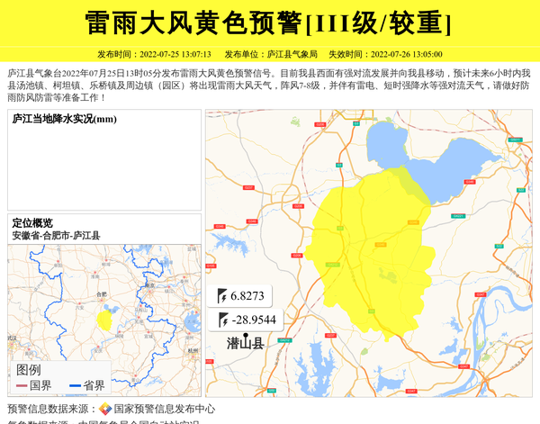 庐江县气象台2022年07月25日13时05分发布雷雨大风黄色预警信号。目前我县西面有强对流发展并向我县移动,预计未来6小时内我县汤池镇、柯坦镇、乐桥镇及周边镇(园区)将出现雷雨大风天气,阵风7-8级,并伴有雷电、短时强降水等强对流天气,请做好防雨防风防雷等准备工作! 信息来源:国家预警信息发布中心; 发布单位:庐江县气象局。