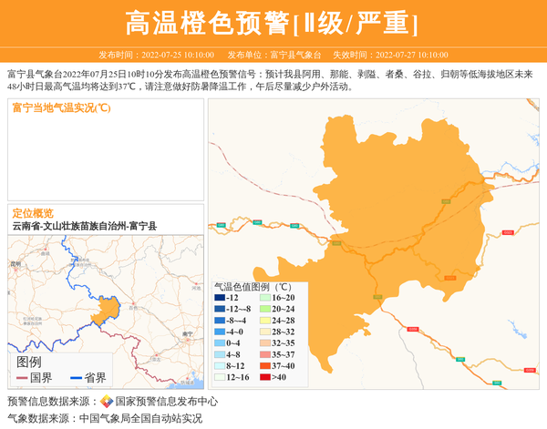 富宁县气象台2022年07月25日10时10分发布高温橙色预警信号:预计我县阿用、那能、剥隘、者桑、谷拉、归朝等低海拔地区未来48小时日最高气温均将达到37℃,请注意做好防暑降温工作,午后尽量减少户外活动。 信息来源:国家预警信息发布中心; 发布单位:富宁县气象台。
