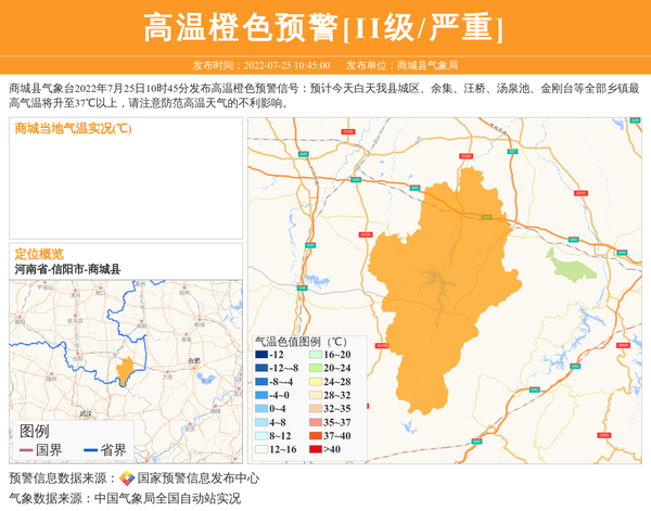 商城县气象台2022年7月25日10时45分发布高温橙色预警信号:预计今天白天我县城区、余集、汪桥、汤泉池、金刚台等全部乡镇最高气温将升至37℃以上,请注意防范高温天气的不利影响。 信息来源:国家预警信息发布中心; 发布单位:商城县气象局。
