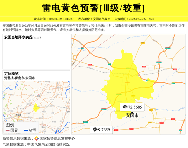 安国市气象台2022年07月25日16时12分发布雷电黄色预警信号:预计未来6小时,我市全部乡镇将有雷阵雨天气,雷雨时个别地点伴有短时强降水、短时大风等强对流天气,请有关单位和人员做好防范准备。 信息来源:国家预警信息发布中心; 发布单位:安国市气象台。