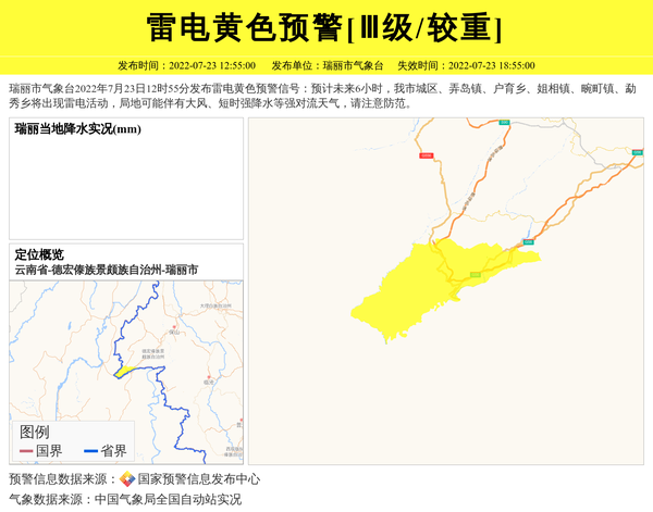 瑞丽市气象台2022年7月23日12时55分发布雷电黄色预警信号:预计未来6小时,我市城区、弄岛镇、户育乡、姐相镇、畹町镇、勐秀乡将出现雷电活动,局地可能伴有大风、短时强降水等强对流天气,请注意防范。 信息来源:国家预警信息发布中心; 发布单位:瑞丽市气象台。